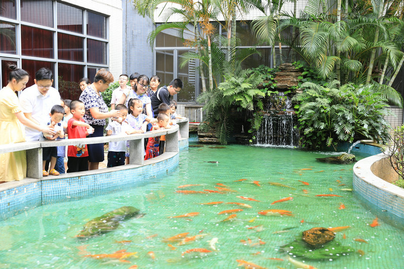 黃的、白的、黑的魚兒在水里游來游去,時不時悄悄冒出水面吐一個夢幻般的空氣泡…..在參觀公司時,小朋友們來到了魚池邊,看到魚兒可興奮極了,并在爸爸媽媽的指導下給魚兒投食。