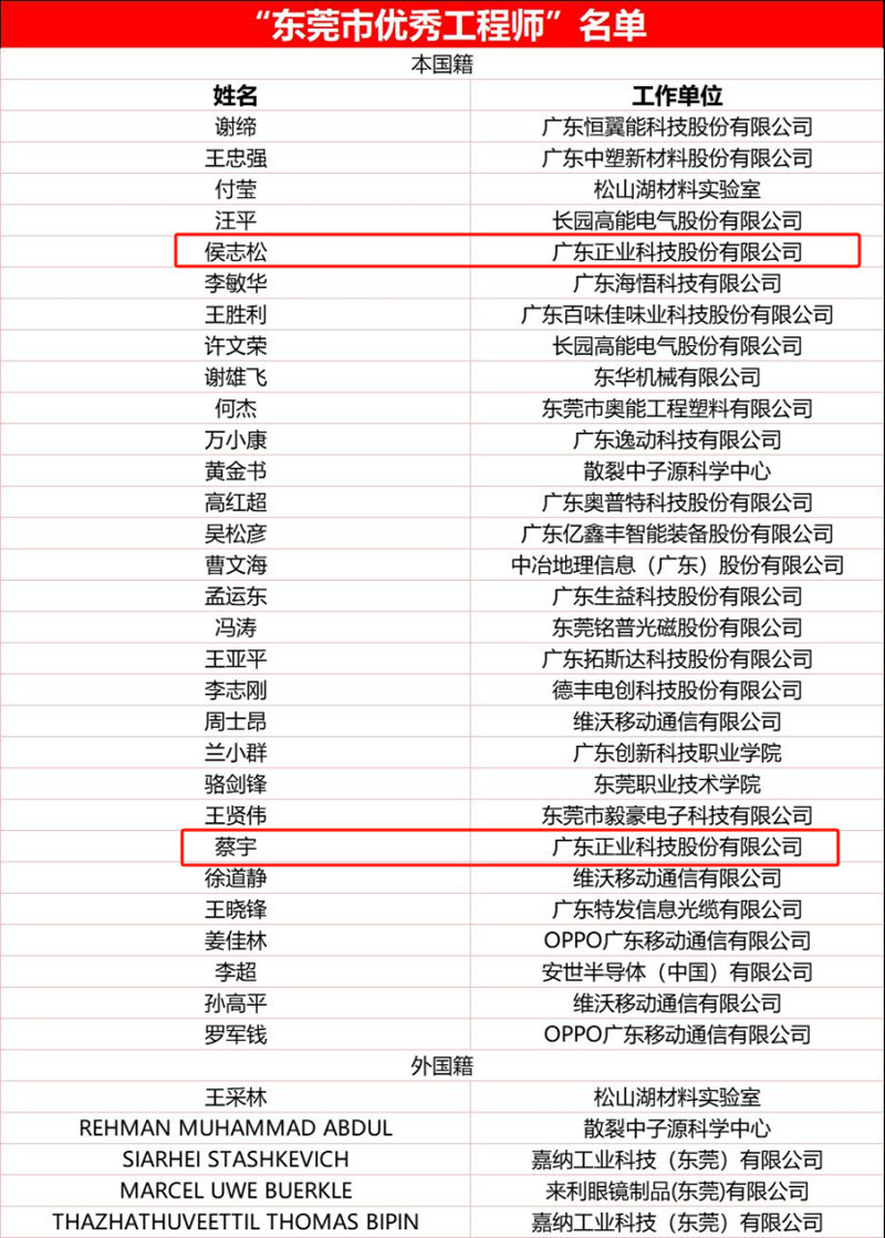 當前,新一輪科技革命和產業變革正在加速演進,科技和人才成為國際戰略博弈主戰場。工程師是推動工程科技造福人類、創造未來的重要力量,是國家戰略人才力量的重要組成部分。在2024年12月8日舉行的“匠心鑄品質 新質創未來”東莞市工程師日慶典及“優秀工程師”發布儀式上,經過激烈的評選,從超過500名候優秀工程師中選出35位杰出代表授予“2024年東莞市優秀工程師”的榮譽稱號,以城市之名致敬工程師!廣東正業科技股份有限公司(以下簡稱正業科技)——蔡宇先生、侯志松先生,憑借其卓越的專業能力和顯著的技術貢獻,榮膺此殊榮。
