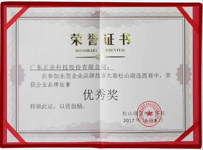 正業(yè)科技市場中心撰寫的《風雨同舟攜手廿載,匠心智造鑄就未來》,以正業(yè)科技20年歷程為藍本,講述正業(yè)科技自主創(chuàng)新走民族品牌之路的故事,榮獲“東莞企業(yè)品牌故事大賽”松山湖選拔賽優(yōu)秀獎。