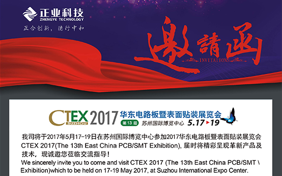 一年一度的華東電路板暨表面貼裝展(CTEX 2017)就要來啦!正業(yè)科技將隆重參加此展會,展示公司最新的技術成果,至誠邀請新老客戶參加蒞臨我司展位觀摩指導。