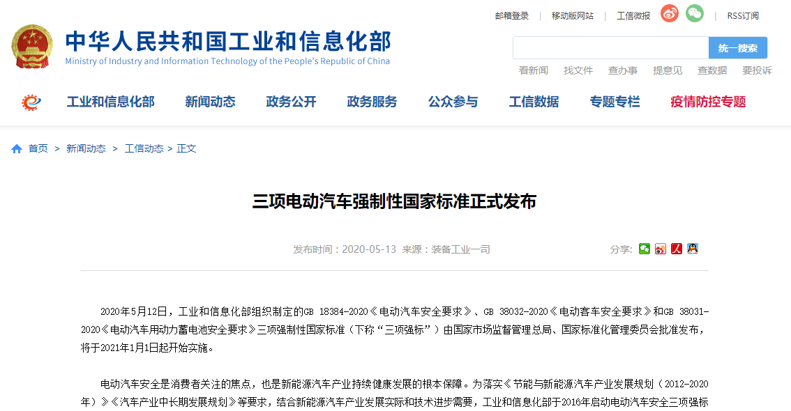 2020年5月12日,工業和信息化部組織制定的GB 18384-2020《電動汽車安全要求》、GB 38032-2020《電動客車安全要求》和GB 38031-2020《電動汽車用動力蓄電池安全要求》三項強制性國家標準由國家市場監督管理總局、國家標準化管理委員會批準發布,進一步提高和優化了對電動汽車整車和動力電池產品的安全技術要求。